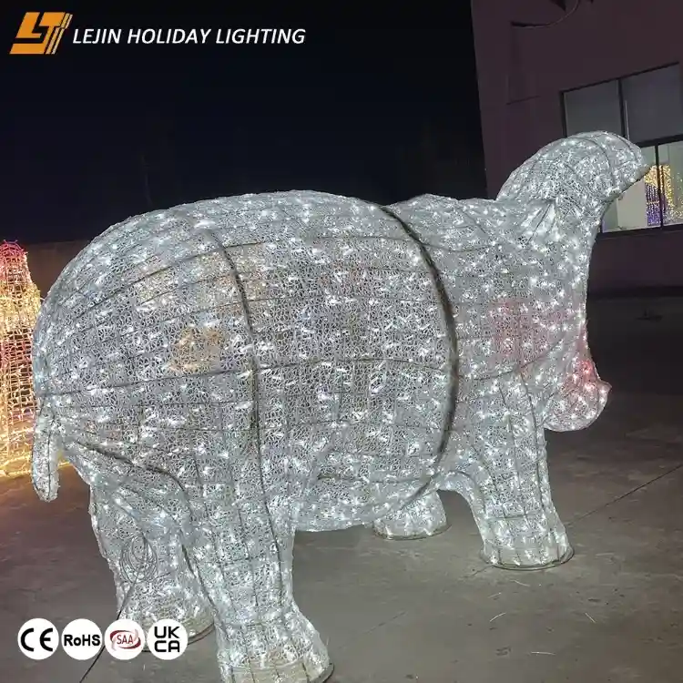 This hippo motif light is mainly divided into 3 parts, the front, tongue and back body, all using aluminum frame as the overall frame, using drip glue technology to cover, white steady rubber string lamp as a light source decoration, the whole use of low voltage 24V transformer control, safety and environmental protection.
